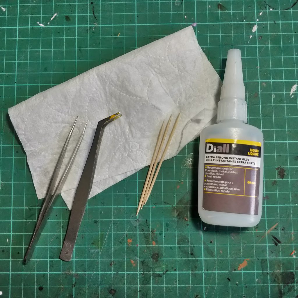 As you may have guessed, the basic material used for this technique is the baby wipe and… that’s pretty much it. The only other thing you need is thin superglue. For manipulating the wipes into the desired shapes, I use a combination of tweezers and cocktail sticks.