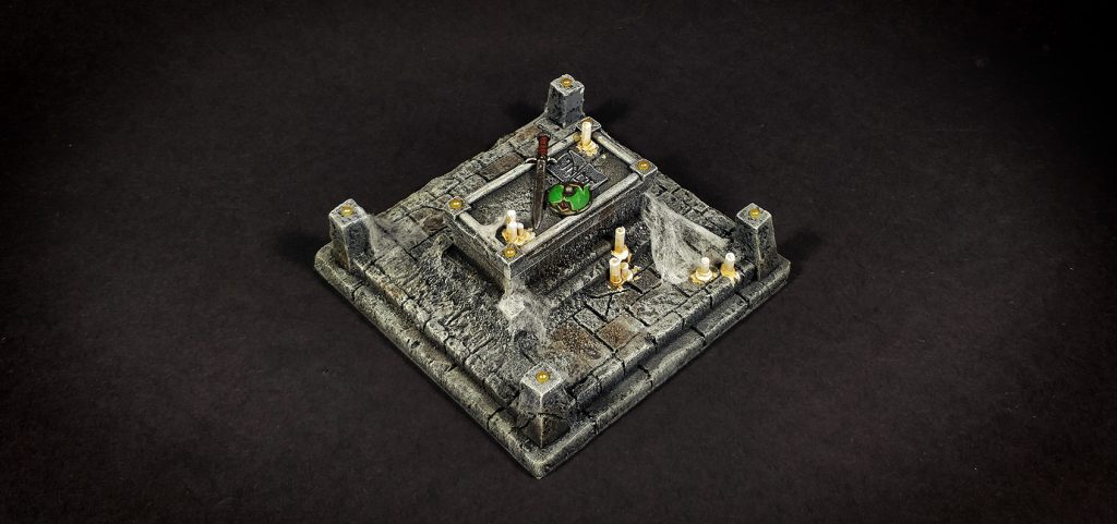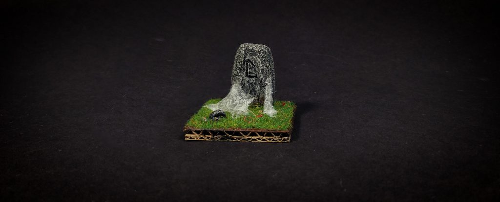These baby wipe cobwebs are a little fiddly to get started with, but once you’ve built up a stock of the basic materials they are pretty satisfying to use on dioramas, or for gaming pieces. They could also be used on scenic bases for zombies, skeletons or other creepy ancient monsters. Below you can see where I’ve used this technique to make a tomb terrain piece look suitably ancient.